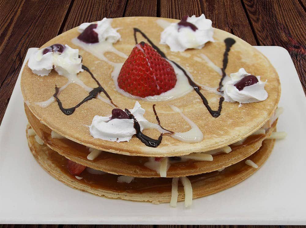 deliciosa galleta triple con doble porcion de salsa de mora, salsa de fresa, queso, arequipe, lechera y maní/grajeas